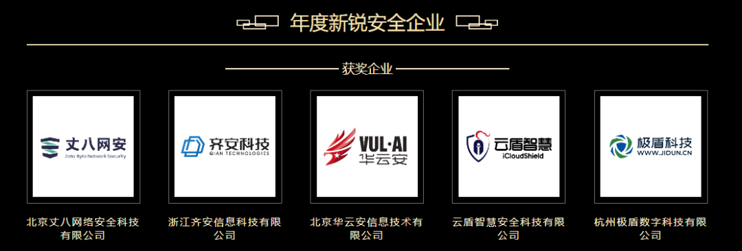 年度新锐安全企业前五名单:北京丈八网络安全科技有限公司、浙江齐安信息科技有限公司、北京华云安信息技术有限公司、云盾智慧安全科技有限公司、杭州极盾数字科技有限公司。