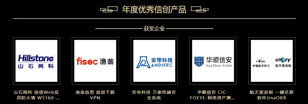 年度优秀信创产品前五名单:山石网科 信创Web应用防火墙 W5160-GC、W3060-GC、渔翁信息 信创干路VPN、安帝科技 万象终端安全系统、华顺信安 CIC-FOEYE-网络资产测绘及风险分析系统(信创版)、航天壹进制 一键还原软件UnaOKR。