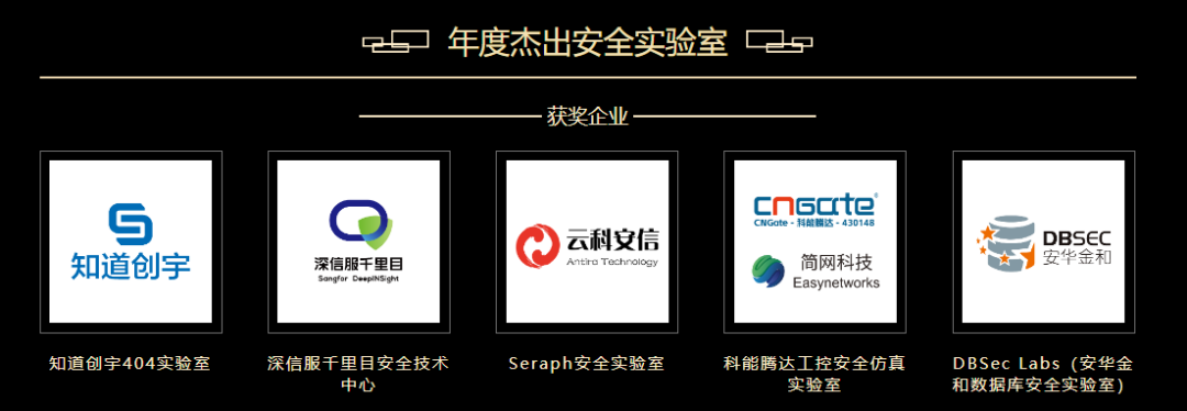 年度杰出安全实验室前五名单:知道创宇404实验室、深信服千里目安全技术中心、云科安信Seraph安全实验室、科能腾达工控安全仿真实验室、DBSec Labs(安华金和数据库安全实验室)。
