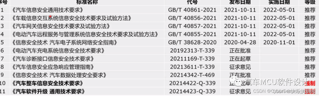 国家强制标准计划《汽车整车信息安全技术要求》、《汽车软件升级通用技术要求》由工业和信息化部组织起草,由全国汽车标准化技术委员会智能网联汽车分会进行执行,目前已处于批准阶段,约2024年进行发布。