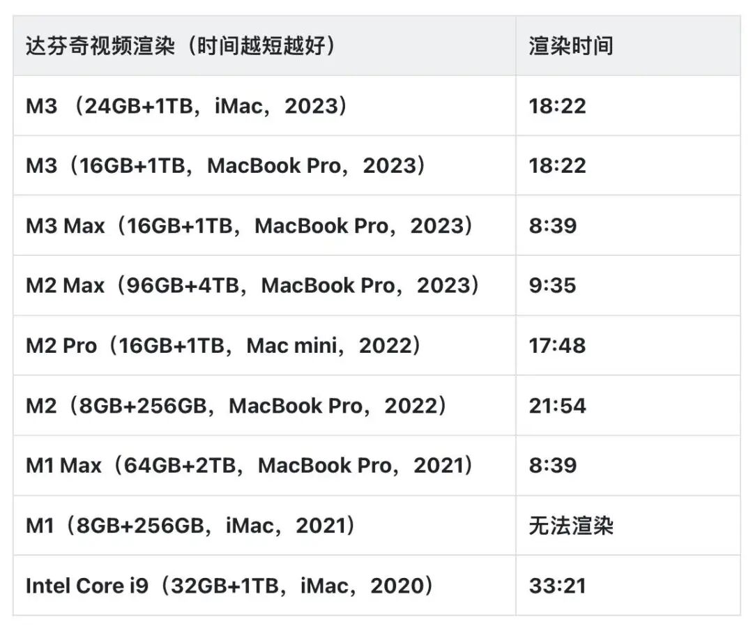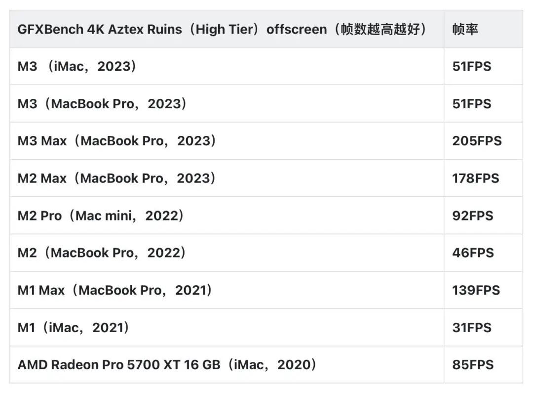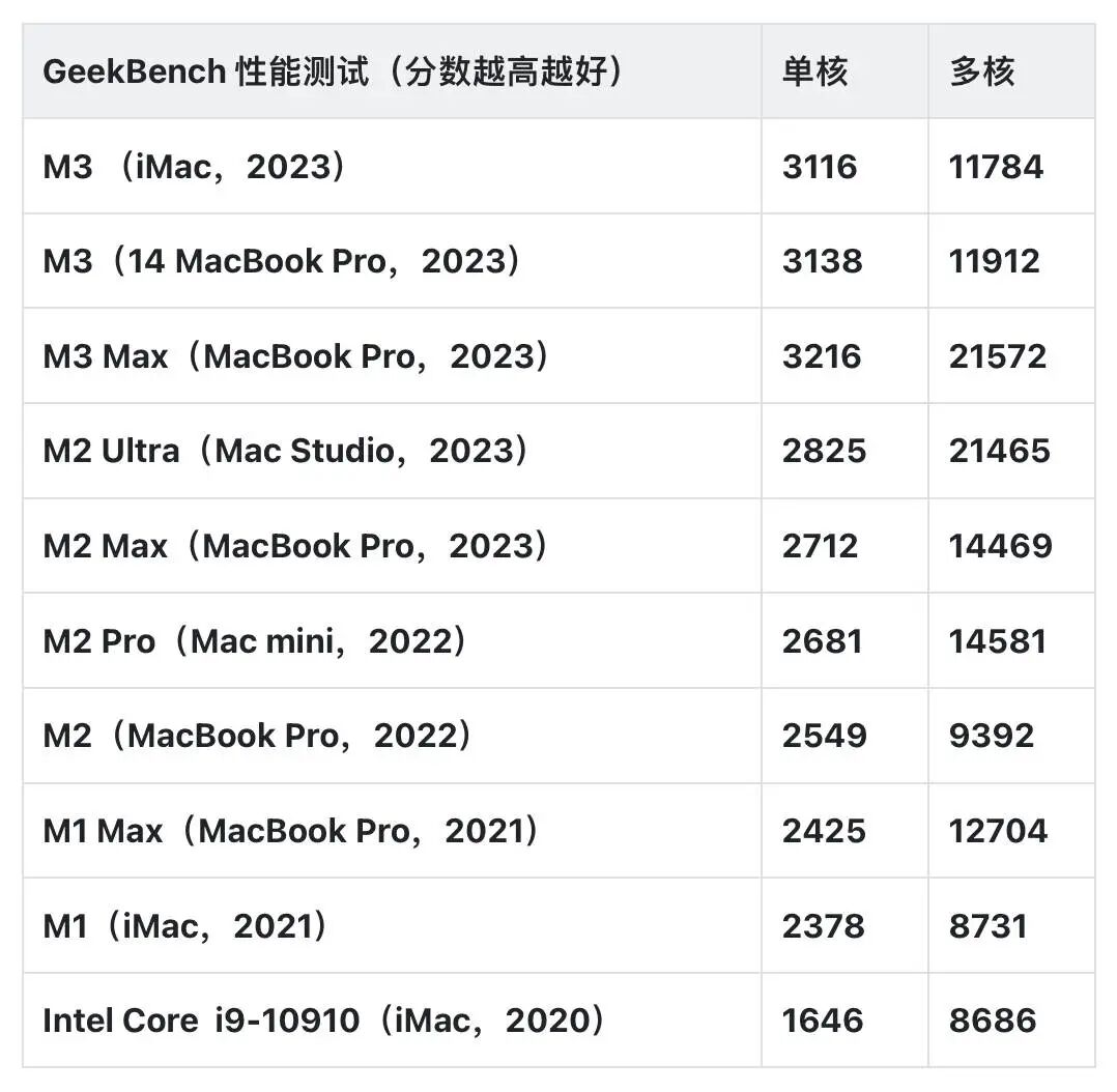 在 Mac 过渡自研芯片的两年半之后,我仍然使用着三年前 iMac 的谢幕之作。这台机器堪称 Intel 的末代机皇:10 核心 i9-10910 处理器,16GB 显存的 Radeon Pro 5700XT ,32GB DDR4 内存,以及 1TB 固态硬盘,时至今日,它对于一个文字工作者而言仍然绰绰有余。而另一方面,随着 Mac Studio 产品线的加入,实际上 iMac 在整个 Mac 产品线的身位从中档降低为中低档:它无法选购 Pro 和 Max 芯片,内存不可插拔,屏幕从 27 英寸 5K 缩小到 24 英寸 4.5K,连曾经的 SD 卡槽也砍掉了。于是,当我拿到新款 iMac,我非常好奇:M3 加持下的 iMac 究竟进步有多大?它能够撬动 Intel 的钉子户吗?轻薄的机身,七彩的外观,硕大的下巴,磁吸的充电线,集成在适配器的网线接口,甚至一模一样的 Lightning 接口的键盘和鼠标,由于延续了上一代 iMac 的设计,我们把评测的重点放在性能测试上。基础款 iMac 配备了8 核 CPU 和 8 核 GPU,8GB+256G,起售价 10999 元。我的评测机型则升级到了 10 核 GPU、24GB 统一内存+1TB 固态硬盘,价格达 19398 元,包括带数字键盘的 Touch ID 键盘、Magic Mouse 和 Magic Trackpad。iMac 上那颗 M3 是业界首批采用 3nm 制程工艺的 PC 芯片,核心数量上与 M2 保持一致,依然采用 4 大核 + 4 小核,10 核 GPU 的设计。值得关注的是,M3 的单核最高频率突破了 4GHz。在 GeekBench 跑分中,无论单核还是多核,相比 M1 iMac 都有着 25% 的提升,其中,多核的表现直逼 M1 Max 和 M2 Max,相比 M2 大约有 20% 左右的提升。当然,M3 和 M3 Max 的差距也被拉得更大,后者的性能表现已经超越了 Mac Studio 上的 M2 Ultra。此时再看三年前 Intel 的末代机皇,已经是垫底的存在,无论是单核多核,几乎被 M3 甩开两倍。相较于 M2,M3 在 GPU 的规格上提升不明显,但引入了 A17 Pro 相似的架构,增加了动态缓存、硬件光线追踪和网格着色的特性,有效地提升了 GPU 在通用计算场景的性能。在 GFXBench 4K Aztex Ruins(High Tier)offscreen 测试中,M3 iMac 测试为 51 FPS,相比 M1 有着接近 40% 的提升,相比 M2 的 MacBook Pro 也有 9% 的提升。而在这一局里,采用了独立显卡的 iMac 2020,表现尚可。从 BlackMagic Disk 的测试中也能看到,新 iMac 相比上一代 iMac 低配版,写入速度有较大提升。但对比 M3 Max 则有着接近一倍的差距。结合前两台产品的规律,芯片等级、固态硬盘的容量,都直接关乎硬盘的读写速度,可见苹果刀法之精准。剪片子是 Mac 的传统强项。我们使用达芬奇渲染了一段 30分钟的 4K 50FPS H.265编码 MP4格式的视频。M3 的 iMac 的渲染速度相比 M2 快了 4 分钟,已经与 M2 Pro 的 Mac mini 相当。而我们那台 8GB 内存的 M1 iMac,由于一直弹窗内存不足,甚至无法完成导出,直接退出战斗。搭载 M3 Max 的机型则显示出巨大的优势,只要一半的时间。不过我们也发现,M3 Max 相较于 M2 Max、M1 Max 并没有显著提升,猜测 M3 的视频编解码性能可能没有明显升级。面对针对 HEVC 做了优化的 M 系列处理器,Intel 的 iMac 则是没有任何竞争力了。另外,M3 iMac 增加了对 AV1 编码的解码能力,这个在看流媒体的时候能降低 CPU 占用率,也算是个特别的升级点。iMac 不是当年的 iMac 了,桌面电脑应该如何选择?如开篇所说,随着 Mac Studio 的出现,以及 iMac Pro 产品线的取消,iMac 的定位在产品线中降低了一个身位,但这也让它的目标用户更加精准——它不再是一台适用于工作室的生产力工具,而是一台适用于多人共享的家用电脑。它轻薄简洁美观的一体设计,集成了电脑主机、摄像头、显示屏、六扬声器系统、麦克风等所有配件,整个设备不足 5 kg。它既不占用桌面空间,又总能成为环境里视线的焦点。正如很多公司、商业收银柜台常常摆着两台 iMac,为空间增色添彩,是 iMac 一个不可忽略的卖点。M3 芯片可以毫无压力地胜任文字、图片和视频剪辑工作,哪怕是相对繁重的 3D 设计,也不会表现明显的性能瓶颈,非常适合没有移动办公场景的家庭环境。此外,每个家庭成员都可以建立自己的账户,凭借 Touch ID 一键登录。由于 iMac 跳过了一代芯片的更新,让这台搭载了 M3 的 iMac 表现出显著的性能差异,相比 M1 有接近一倍的提升,但如果对标 MacBook Air 上的 M2,提升就相对有限了。如果你是 21 英寸 Intel iMac 的钉子户,M3 iMac 是非常理想的继任者,无论是浏览网页、后期修图剪片,你都能感到明显速度的提升。至于 27 英寸的 iMac 用户,则需要在屏幕尺寸上做一些妥协,或者考虑 Studio Display + 电脑的方案。如果你是三年前 M1 iMac 的用户,选购的是 8GB 内存版本,可以视日常运行的情况考虑是否置换 M3 iMac。在 M3 iMac 的配置选择上,我们建议至少 16GB+512GB 的版本。至于 iMac 、Mac mini 和 Mac Studio 如何选择:如果不考虑桌面空间利用率,更在乎实用性,Mac mini+显示器,不失为一个更经济的选择。如果你从事大量繁重的 3D 渲染和建模的工作,搭载 M2 Ultra 的 Mac Studio,依然代表了苹果最强的桌面性能。最后的建议是,如果你以创作内容为生,不要去等待一个可能会变得更好的设备,时间才是创作者最稀缺的生产力。![]()