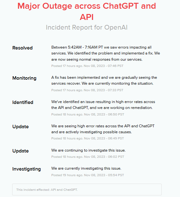 11月8日,OpenAI基于大型语言模型的ChatGPT聊天机器人因为一次重大的持续故障而宕机,这次故障还导致了该公司的应用程序接口(API)也无法使用。