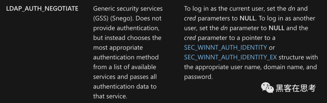 再或是,可以不使用获取的明文域凭据走代理去连接LDAP,可以直接使用目标的机器执行我们的程序,比如C++中连接LDAP时候,在ldap_bind时,我们可以这样设置,这样就会使用当前用户凭据。