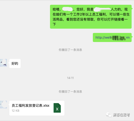 我们不必去寻找一个WEB服务,况且现在也没有已控WEB应用,我们就自己构建临时的WEB服务,现在已经有了内网DNS记录,可以直接添加对应人的微信,伪造一个WEB页面,以员工福利的理由让他点开链接。