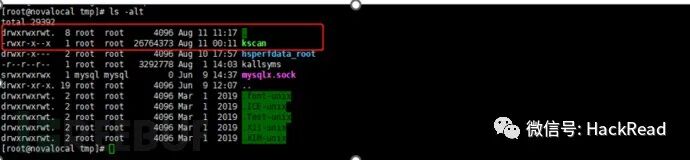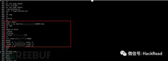 查看历史命令history,发现攻击者的Bash反弹命令,并且发现攻击者还上传扫描工具Kscan文件到tmp目录下,尝试扫描172.xx.xx.xx/24网段,且连接Mysql数据库。