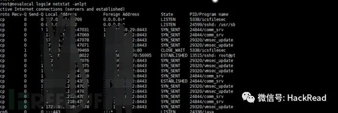 查看网络连接情况,因主机进行隔离,攻击者的Bash反弹断开,无其它可疑网络连接。