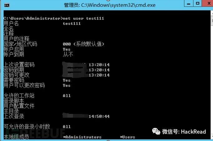 攻击者于13:20:14 添加了后门用户test111,并将其添加到管理员组中。