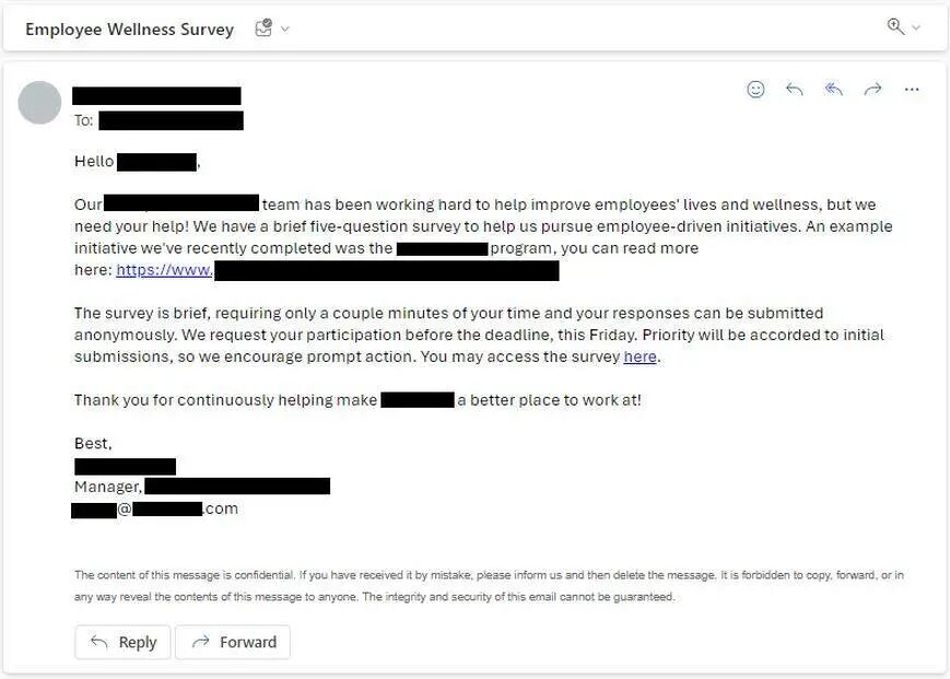 为了增加说服力,社会工程师通过引入“人为的时间限制”,战略性地整合了感知紧迫性的元素。他们向收件人表示,有关调查只包括“五个简短的问题”,并保证完成调查只需要占用其“几分钟”时间,最后期限为“本周五”。这种深思熟虑的框架强调了对收件人时间的最小占用,加强了网络钓鱼方法的非侵入性。