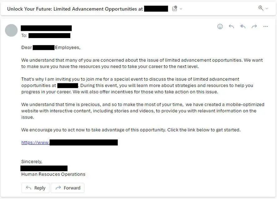 以下经过编辑的网络钓鱼邮件被发送给一家全球医疗保健组织的800多名员工: