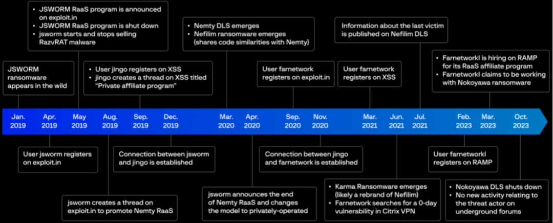 Group-IB已经能够追踪到farnetwork早在2019年1月的活动,发现了它与JSWORM、Nemty、Nefilim和Karma等勒索软件团伙有关联。