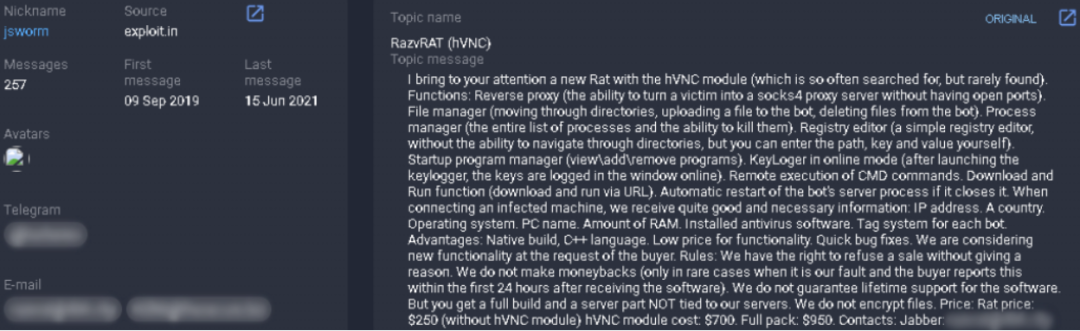 2019年4月,farnetwork在Exploit黑客论坛上大肆推广JSWORM RaaS项目,这伙威胁组织对RazvRAT恶意软件大打广告。