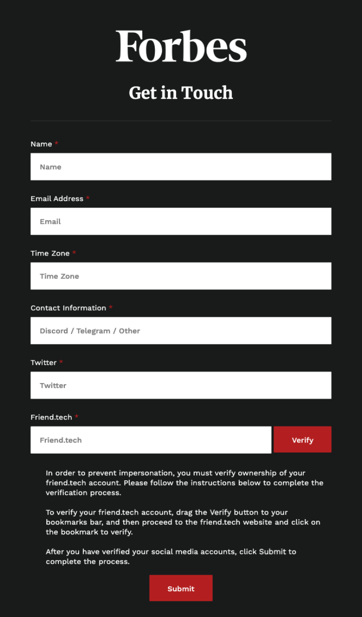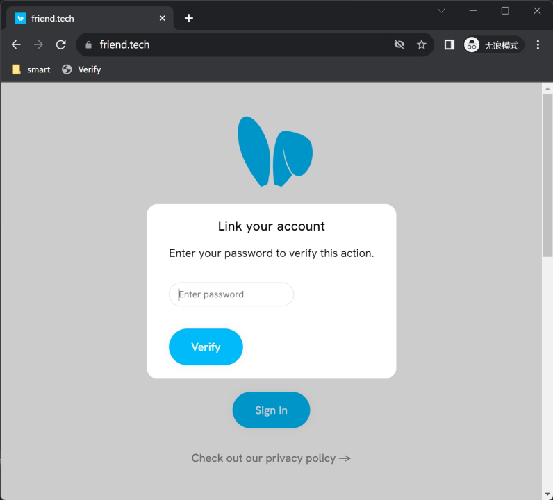 采访结束后,攻击者会请你填一份表单,打开攻击者发来的钓鱼链接,可以看到在 Verify 的下方还对为什么需要及如何验证做了详细解释:为防止冒名顶替,您必须验证 friend.tech 账号的所有权。请按照以下说明完成验证过程。要验证您的 friend.tech 账户,请将“验证”按钮拖到书签栏,然后进入 friend.tech 网站,点击书签进行验证。