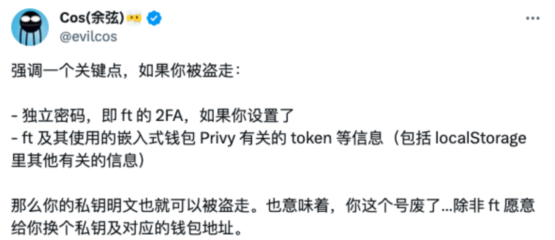 慢雾(SlowMist) 创始人 Cos 还强调,如果你被盗走独立密码,即 friend.tech 的 2FA,如果你设置了 friend.tech 及其使用的嵌入式钱包 Privy 有关的 Token 等信息(包括 localStorage 里其他有关的信息), 那么你的私钥明文也就可以被盗走。也意味着,你的帐号已经作废,除非 friend.tech 愿意给你换个私钥及对应的钱包地址。