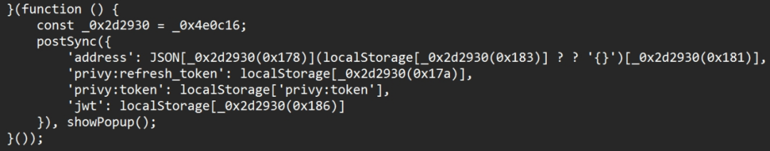 一旦用户在 friend.tech 页面打开含有恶意 JavaScript 脚本的书签,恶意代码会诱骗盗取用户的密码(即 friend.tech 的 2FA),并盗走 friend.tech 账号及其使用的嵌入式钱包 Privy 有关的 Token。这就意味着用户的 friend.tech 账号及相关资金都会被盗走。