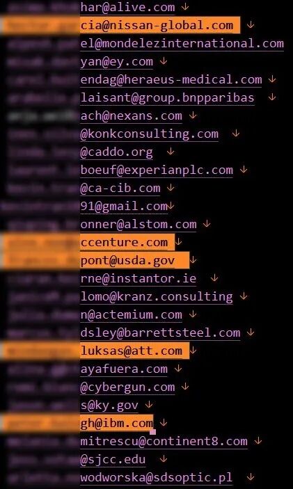 下边的截图显示,一部分泄露的电子邮件地址属于美国高级政府官员和机构。此外,还发现了来自世界各地各个政府机构的电子邮件地址。