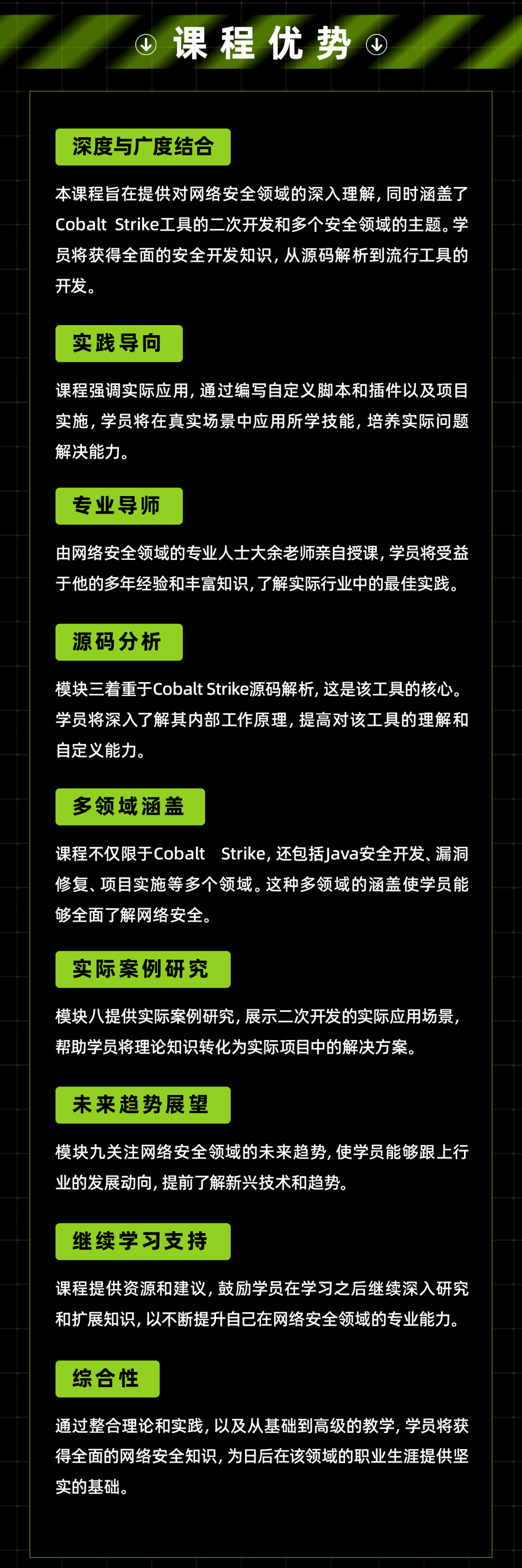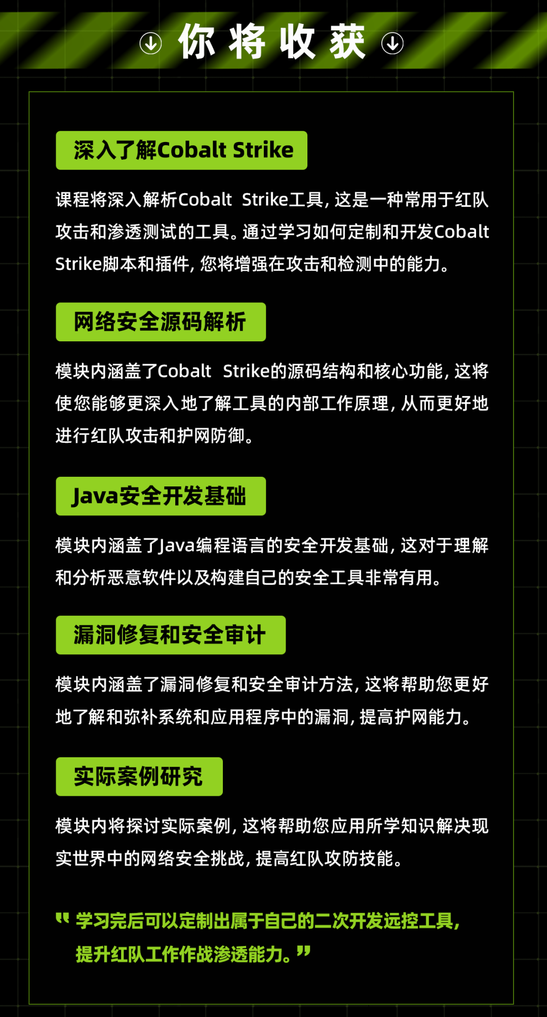 学完后你的能力可以达到红队安全开发岗位的工作要求,具有岗位竞争的能力。