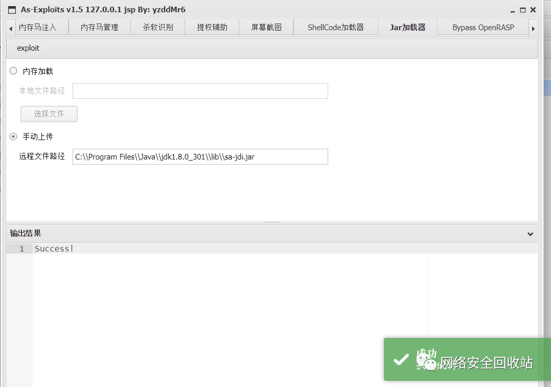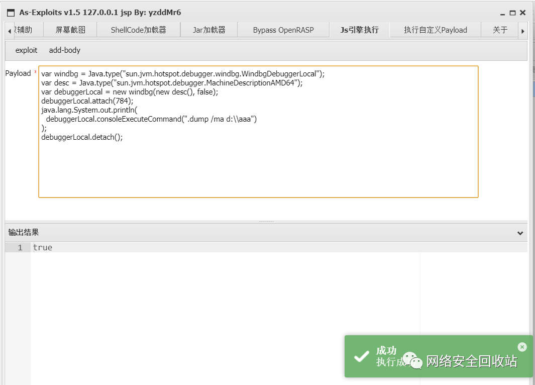 第二点,在As-Exploits 1.5中新增了JS引擎执行模块,这里我采用了JS引擎来实现功能的调用。(当然写个Class编译然后再defineClass加载也可以,稍微有点麻烦)