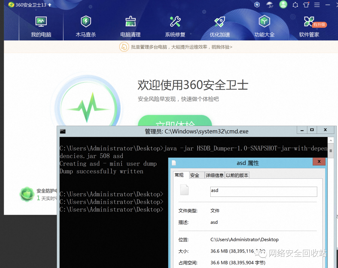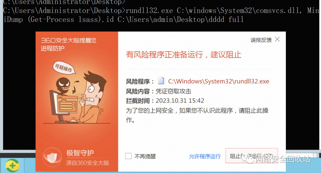 为了对比测试,继续跑一下已经公开过的白利用。360告警拦截,dump提示拒绝访问。