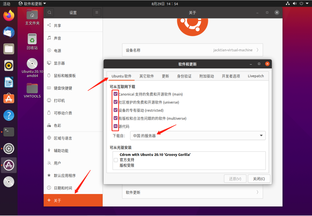前期,我在排查的时候,不仅通过查看系统版本,还调试过系统设置 >>> 软件更新 >>> Ubuntu 软件 >>> 勾选如下四个选项,并将源代码下载自改为:中国的服务器。