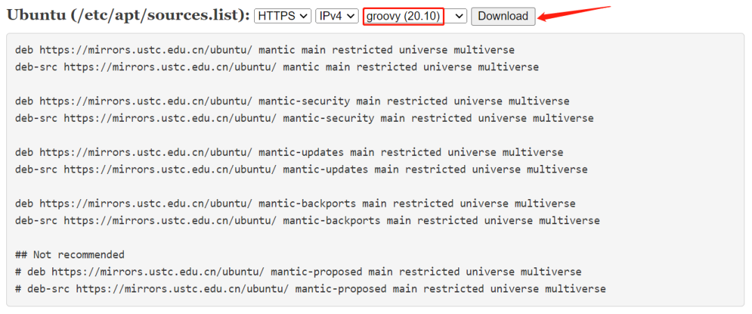 通过如下网站,找到 Ubuntu (/etc/apt/sources.list) 部分,选择 groovy(20.10)版本,即可下载 sources.list 源配置文件。