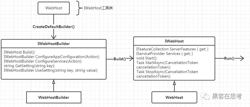 程序首先由CreateWebHostBuilder方法创建一个IWebHostBuilder对象,并调用Build方法得到IWebHost对象的实例,然后调用对象的Run()方法运行;还有Start()方法也可以运行,区别是前者以阻塞的方式运行。