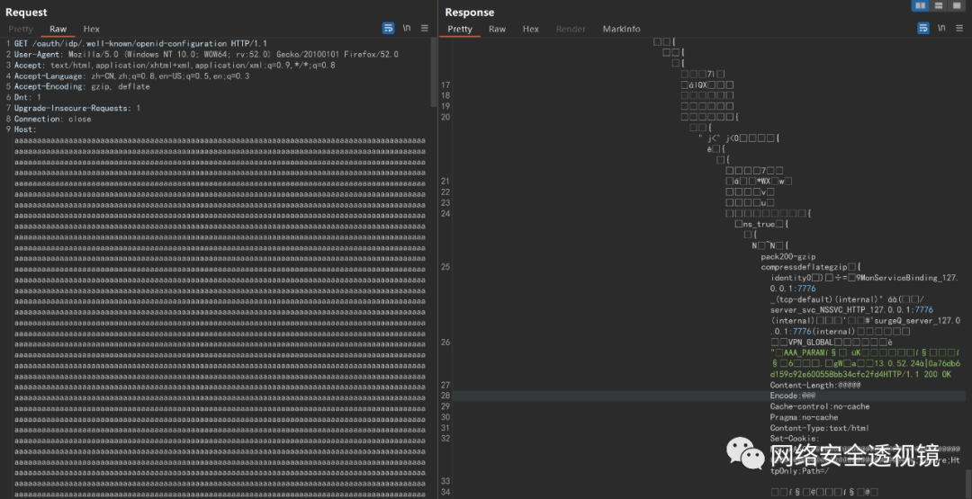 在POC访问成功后,将Host字段里面的IP端口改成 24576个a(其他字母也可以)