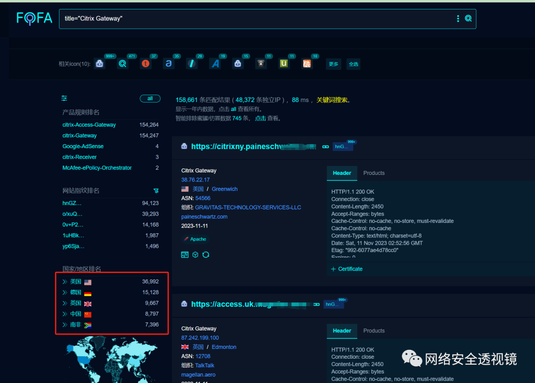 通过fofa查询我们可以看到此设备在全世界的分布情况。