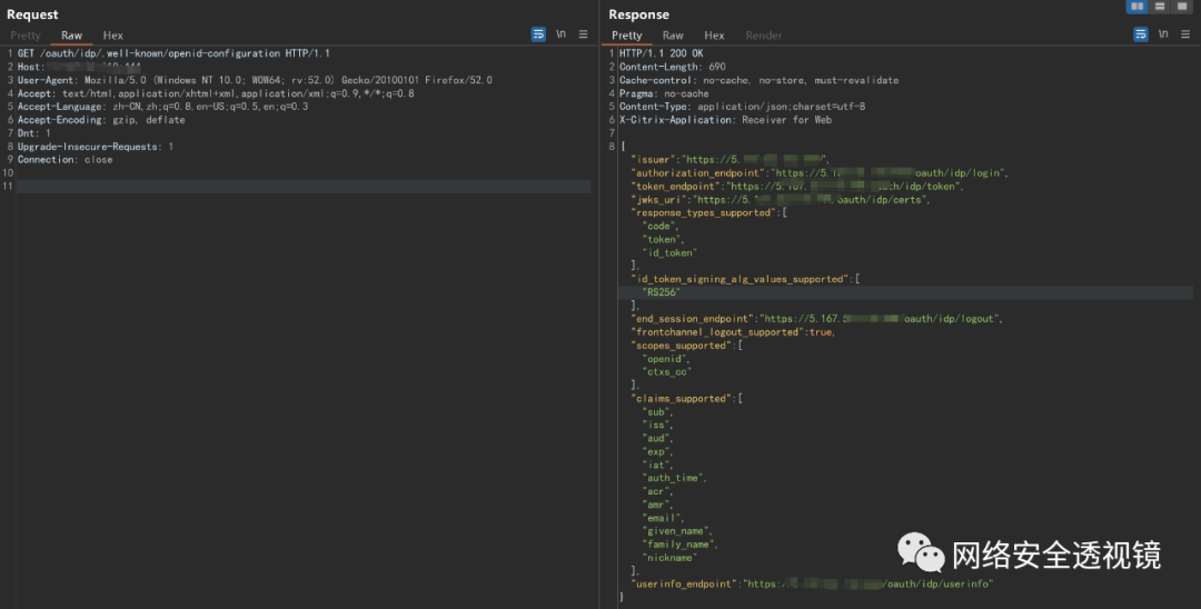 GET /oauth/idp/.well-known/openid-configuration HTTP/1.1Host: ip:portUser-Agent: Mozilla/5.0 (Windows NT 10.0; WOW64; rv:52.0) Gecko/20100101 Firefox/52.0Accept: text/html,application/xhtml+xml,application/xml;q=0.9,*/*;q=0.8Accept-Language: zh-CN,zh;q=0.8,en-US;q=0.5,en;q=0.3Accept-Encoding: gzip, deflateDnt: 1Upgrade-Insecure-Requests: 1Connection: close