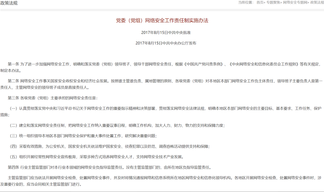 第二条 网络安全工作事关国家安全政权安全和经济社会发展。按照谁主管谁负责、属地管理的原则,各级党委(党组)对本地区本部门网络安全工作负主体责任,领导班子主要负责人是第一责任人,主管网络安全的领导班子成员是直接责任人。