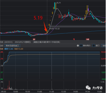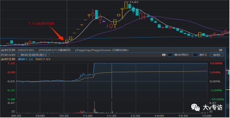 案例一:翠微股份周期,1.13日金财互联在翠微股份的影响下,首板拉起,可以看一下分时图: