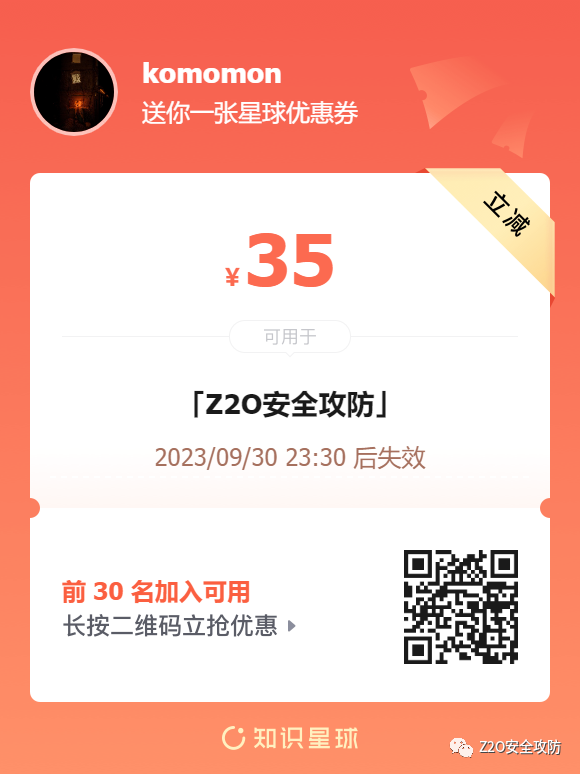 PS:随之星球内知识的积累,人员的增加,价格也会只涨不跌,目前限时优惠。加入【Z2O安全攻防】知识星球,你会获得: