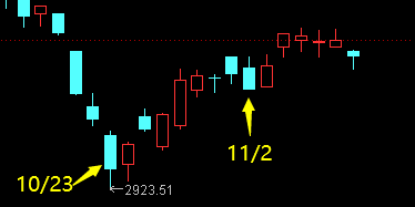 从上图能看到两个周期,两波周期的起始点分别是10月23日和11月2日之后,11月3日开始的是最近这波周期,周四周五大退潮。