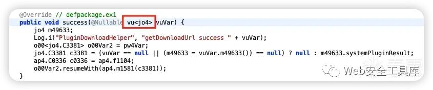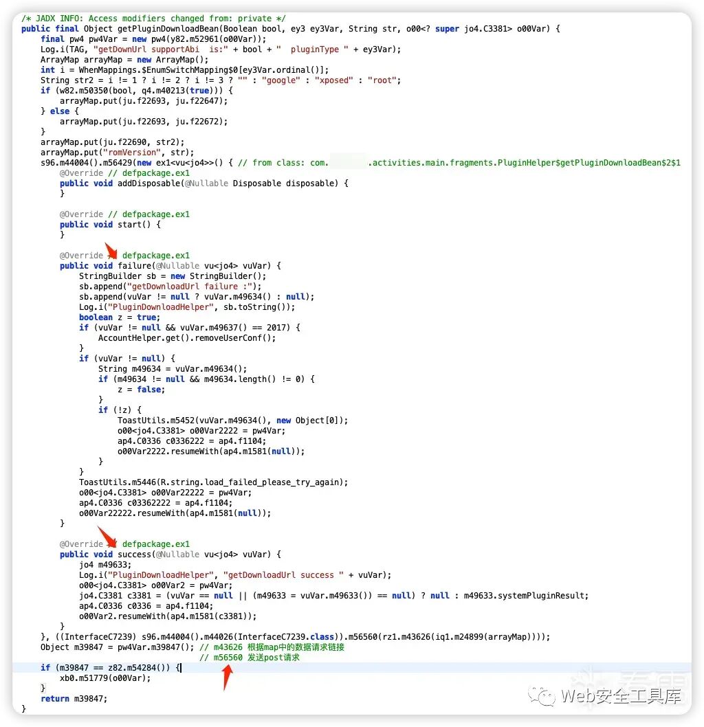 在jadx中搜索getPluginUrl,通过阅读此函数发现有2个匿名函数,failure和success