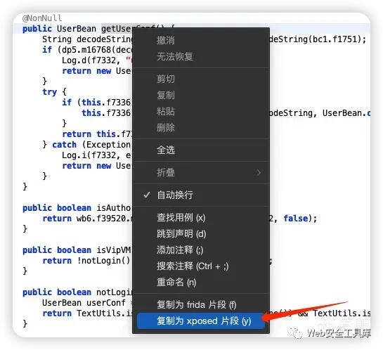 可以看到jadx为我们一键生成了有关的Hook代码,但是这样就行了吗?我可以告诉你,不行。别忘了,这是一个加壳的应用,即使它是一款免费的加壳