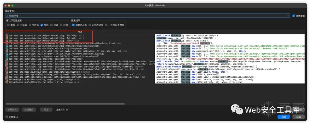打开jadx将脱壳后的dex文件载入,搜索checkVip