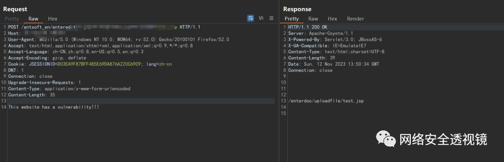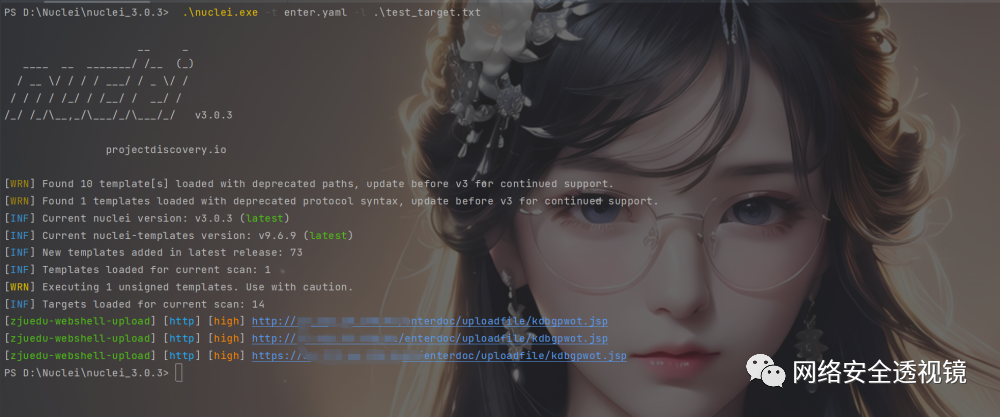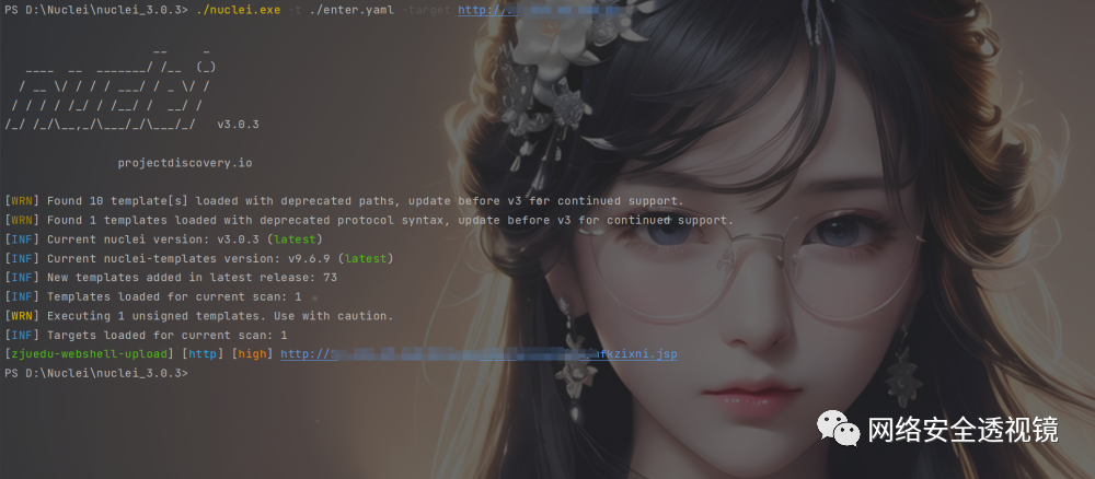 .\nuclei.exe -t enter.yaml -l .\test_target.txt关注微信公众号 网络安全透视镜 回复 20231113 获取POC和Nuclei检测脚本