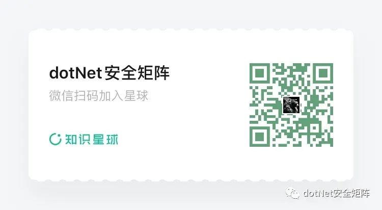 为了更好地应对基于.NET技术栈的风险识别和未知威胁,dotNet安全矩阵星球从创建以来一直聚焦于.NET领域的安全攻防技术,定位于高质量安全攻防星球社区,也得到了许多师傅们的支持和信任,通过星球深度连接入圈的师傅们,一起推动.NET安全高质量的向前发展。经过运营团队成员商议一致同意给到师傅们最大优惠力度,只需129元就可以加入我们。