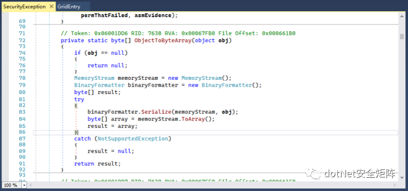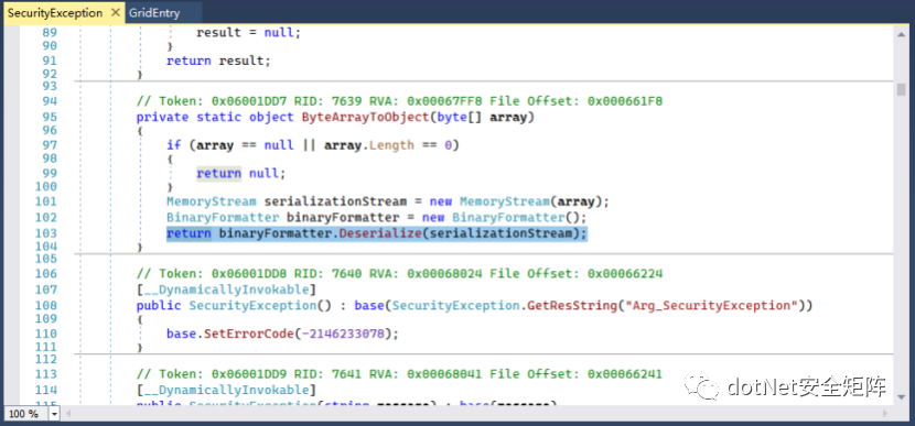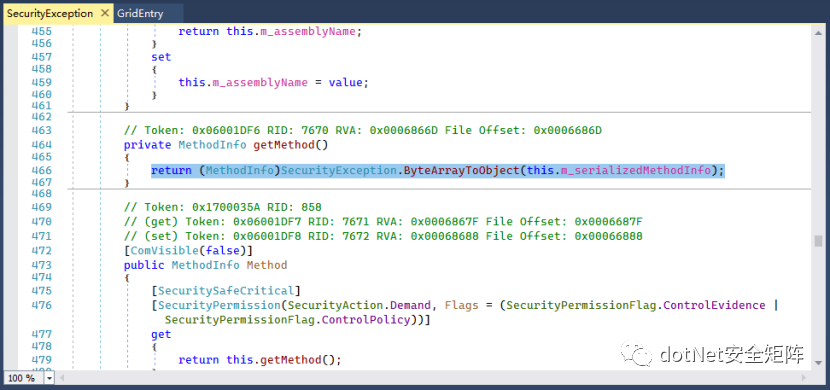因此访问SecurityException对象的Method属性时触发的getMethod()方法,一定是通过BinaryFormatter格式化器反序列化对象,打开后发现调用了ByteArrayToObject,如下图所示