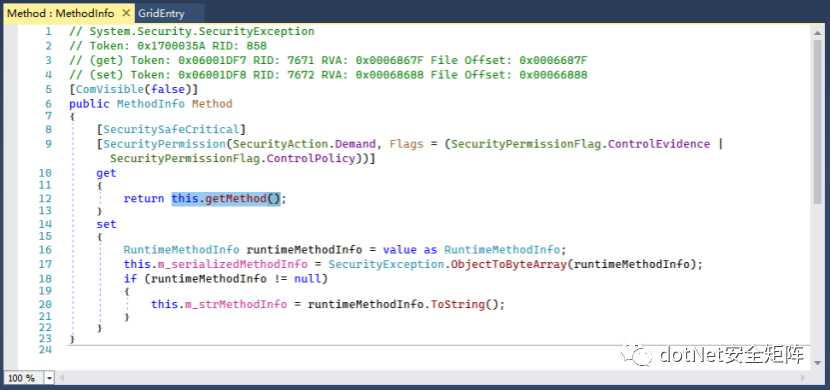 SecurityException类的Method成员,对象访问器Getter调用了内部方法this.getMethod(),修改器Setter通过ObjectToByteArray方法转换为字节,如下图所示