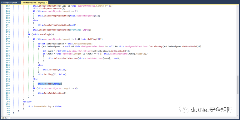 System.Windows.Forms.PropertyGrid 是Windows Forms中的一个控件,通常用于创建属性窗格,便于用户直观地查看和编辑对象的属性值。这个gadget是通过修改器setter设置SelectedObjects属性时触发的,该setter很复杂并且包含大量代码,重要的是Refresh()方法,如下图所示