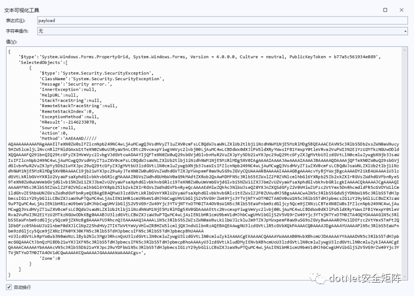 Method是一组进行Base64编码后基于BinaryFormatter生成的攻击载荷,原理前文已经分析过,此处不再赘述,调试时打印出完整的Payload,如下贴图所示