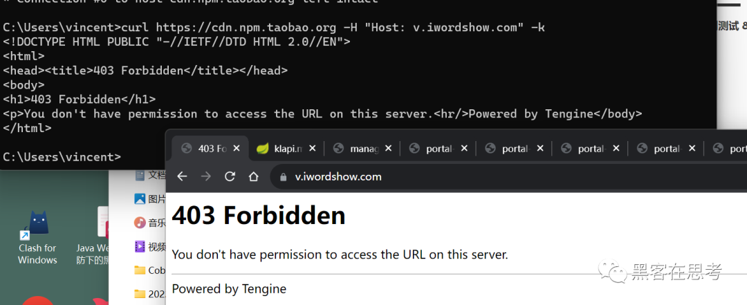 假如说v.iwordshow.com(网上找的别人注册的,充当自己注册的测试使用)是我们在CDN厂商注册的域名,想要回源到C2,只需要更改其Host即可访问到v.iwordshow.com,但网络连接层面没有v.iwordshow.com出现,完全是与白域名cdn.npm.taobao.org白域名交互。