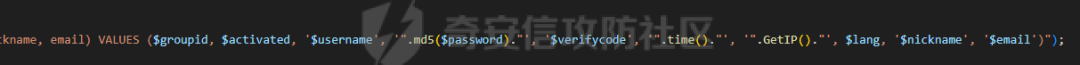 "INSERT INTO " . TABLE_PREFIX . "user (groupid, activated, username, password, verifycode, joindate, joinip, lang, nickname, email) VALUES ($groupid, $activated, '$username', '".md5($password)."', '$verifycode', '".time()."', '".GetIP()."', $lang, '$nickname', '$email')"