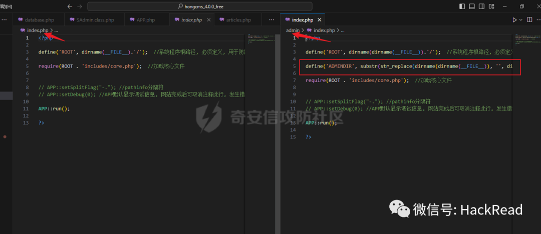 查看两个文件,发现它们没有什么不同之处,定义了ROOT,然后进入APP:run()。除了admin文件夹下的index文件中定义了一个常量ADMINDIR。