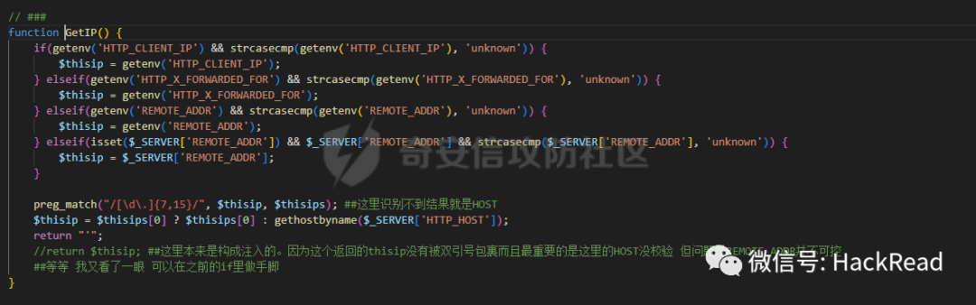 这个GetIP()是没有经过过滤函数的。虽然大多数CMS中这个IP是不可控的,但笔者属于不是很信邪的那一款。于是跟进GetIP函数: