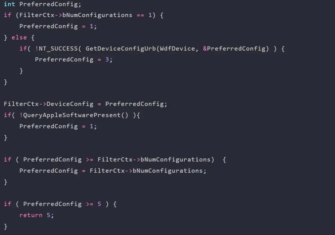 该函数将首先检查设备的配置数是否为1。如果是,则将首选配置设置为1;如果没有,代码将发送一个URB来检索首选配置;如果URB请求失败,则首选配置为3。然后代码在FilterCtx结构中设置DeviceConfig字段。然后,它检查QueryAppleSoftwarePresent函数是否返回false(表示未安装AppleSoftware),如果是,则将首选配置设置为1。然后,代码检查首选配置是否大于或等于设备描述符中指定的配置数;如果是,则将首选配置设置为最大配置数。最后,如果首选配置大于或等于5,则代码返回5。