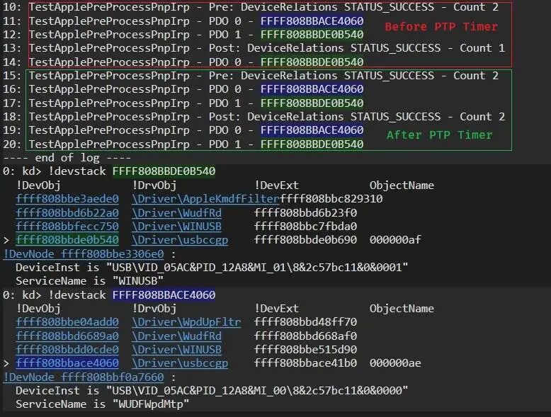 最后,在发送PTP/MTP请求后,PtpTimer将调用IoInvalidateDeviceRelations,其关系类型为BusRelation,这将触发一个新的IRP QueryDeviceRelations,但由于这次计时器已经执行,处理程序不会从设备列表中删除WPD设备。这次PnP管理器我们会看到WPD设备的PDO并开始为它构建堆栈。下图显示了通过将LowerFilter添加到堆栈中并跟踪Pre和Post捕获的这种行为,IRP由AppleLowerFilter处理。