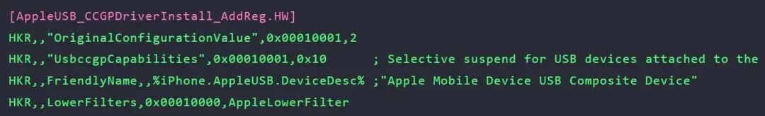 这个INF文件包含不同设备的各种设置配置(例如AppleUSB, AppleUsbHomePod和AppleUsbWatch)。对于iOS设备,HardwareId将完全匹配,因此操作系统将应用AppleUSB设置配置,这将复制AppleLowerFilter.sys,并将在设备特定的注册表项下添加以下值: