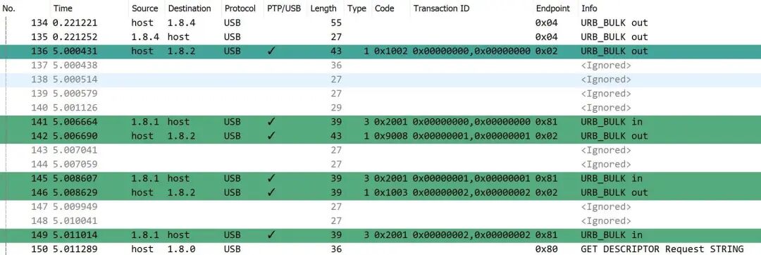 下面的USB数据包捕获说明了这些操作的执行,注意它们是如何在该端口上捕获大约5秒后发生的。